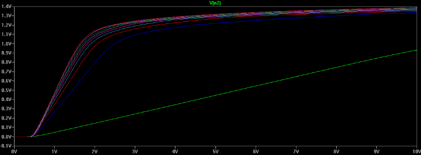 In the above picture output voltage is swept and load resistance is stepped from 1k to 100k with a step of 10k. With 100k load 1.3V reference becomes 1.25V reference and output voltage decreases quickly when load resistance is decreased with a 1k load reference doesn't work correctly anymore. This plot is made with R2 changed to 10k.